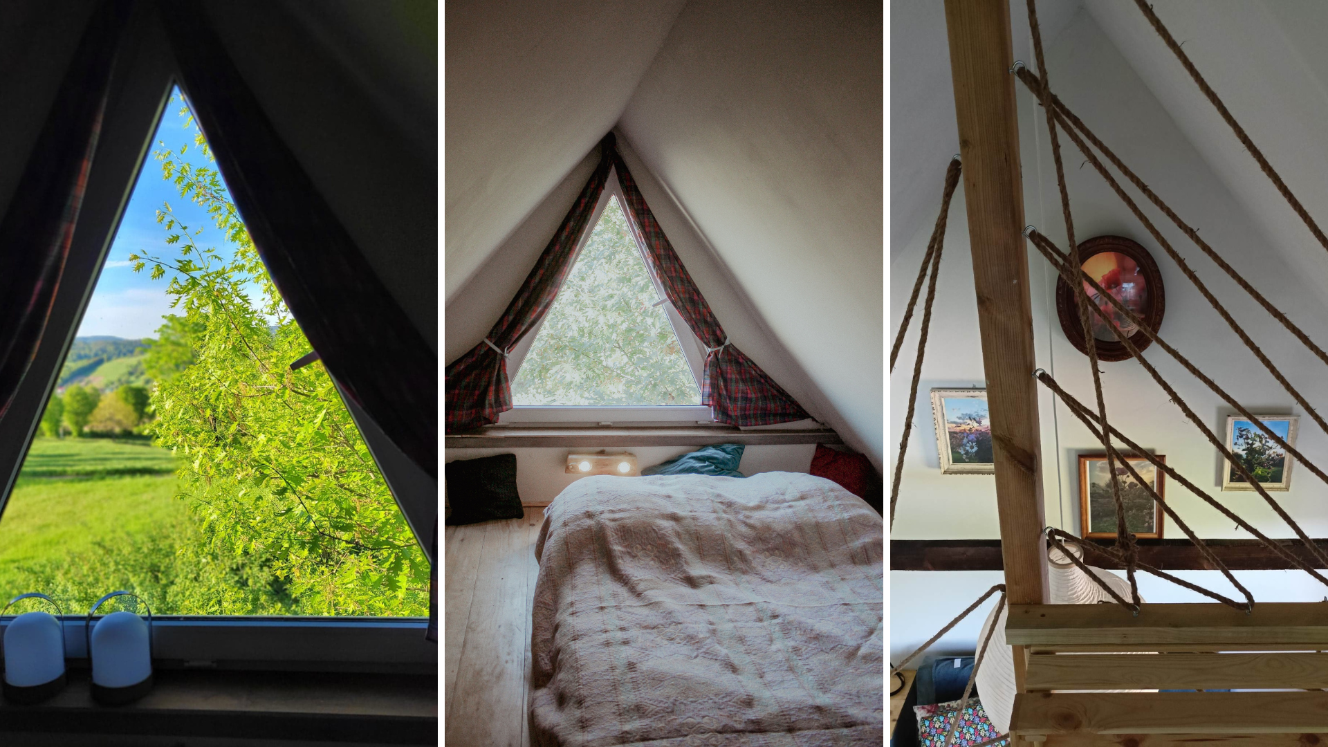 Na atresoli znajduje się część sypialna z dużym dwuosobowym materacem. Z okna rozpościera się piękny widok na pobliskie pasmo gór Żuków.