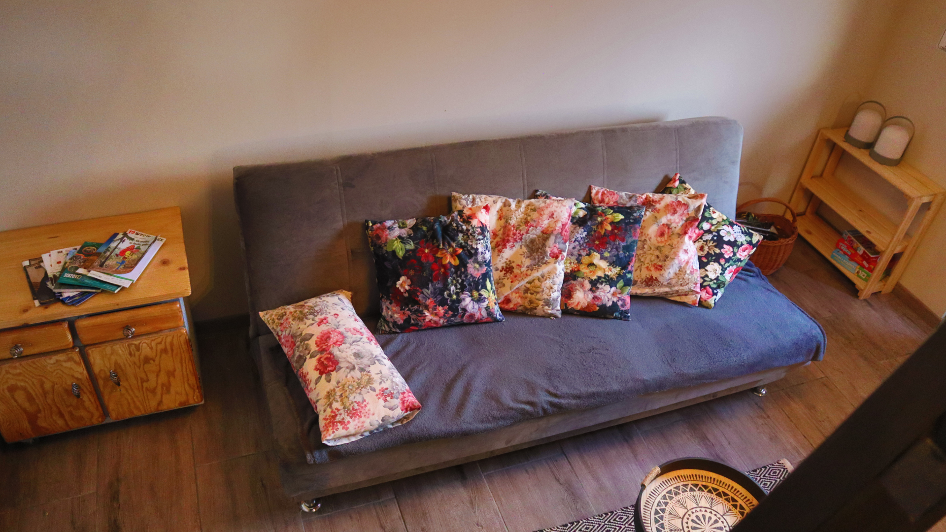 Na parterze znajduje się salon z dwuosobową kanapą i przestronnym aneksem kuchennym, wyposażony w lodówkę, czajnik, kuchenkę indukcyjną i kuchenkę mikrofalową.